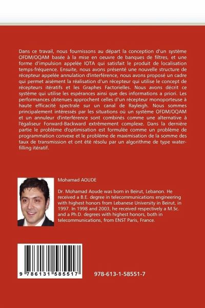 Dans ce travail, nous fournissons au départ la conception d'un système OFDM/OQAM basée à la mise en oeuvre de banques de filtres, et une forme d'impulsion appelée IOTA qui satisfait le produit de localisation temps-fréquence. Ensuite, nous avons présenté une nouvelle structure de récepteur appelée annulation d'interférence, nous avons proposé un cadre qui permet aisément la réalisation d'un récepteur qui utilise le concept de récepteurs itératifs et les Graphes Factorielles. Nous avons décrit ce système qui utilise les espérances ainsi que des informations a priori. Les performances obtenues approchent celles d'un récepteur monoporteuse à haute efficacité spectrale sur un canal de Rayleigh. Nous sommes principalement intéressés par les situations où un système OFDM/OQAM et un annuleur d'interférence sont combinés comme une alternative à l'égaliseur Forward-Backward extrêmement complexe. Dans la dernière partie le problème d'optimisation est formulée comme un problème de programmation convexe et le problème de maximisation de la somme des taux de transmission et ont été résolu par un algorithme de type water-filling itératif.