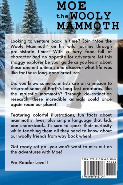Looking to venture back in time? Join "Moe the Wooly Mammoth" on his wild journey through pre-historic times! With a furry face full of character and an appetite for adventure, let this shaggy explorer be your guide as you learn about these ancient animals and discover what life was like for these long-gone creatures. Did you know some scientists are on a mission to resurrect some of Earth's long-lost creatures, like the majestic mammoth? Through de-extinction research, these incredible animals could once again roam our planet! Featuring colorful illustrations, fun facts about mammoths' lives, plus simple language that kids can understand...it's sure to spark their curiosity while teaching them all they need to know about our woolly friends from way back when! Get ready set go -you won't want to miss out on the adventures with Moe! Pre-Reader Level 1