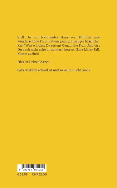 Stell Dir ein brennendes Haus vor. Drinnen eine wunderschöne Frau und ein ganz grauseliger hässlicher Kerl? Wen würdest Du retten? Genau, die Frau. Also bist Du auch nicht schwul, sondern hetero. Ganz klarer Fall. Komm zurück!Dies ist Deine Chance!(Wer wirklich schwul ist und so weiter: Echt cool!)