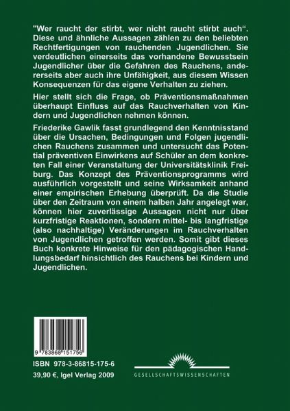 "Wer raucht der stirbt, wer nicht raucht stirbt auch". Diese und ähnliche Aussagen zählen zu den beliebten Rechtfertigungen von rauchenden Jugendlichen. Sie verdeutlichen einerseits das vorhandene Bewusstsein Jugendlicher über die Gefahren des Rauchens, andererseits aber auch ihre Unfähigkeit, aus diesem Wissen Konsequenzen für das eigene Verhalten zu ziehen. Hier stellt sich die Frage, ob Präventionsmaßnahmen überhaupt Einfluss auf das Rauchverhalten von Kindern und Jugendlichen nehmen können. Friederike Gawlik fasst grundlegend den Kenntnisstand über die Ursachen, Bedingungen und Folgen jugendlichen Rauchens zusammen und untersucht das Potential präventiven Einwirkens auf Schüler an dem konkreten Fall einer Veranstaltung der Universität Freiburg. Das Konzept des Präventionsprogramms wird ausführlich vorgestellt und seine Wirksamkeit anhand einer empirischen Erhebung überprüft. Da die Studie über den Zeitraum von einem Jahr angelegt war, können hier zuverlässige Aussagen nicht nur über kurzfristige Reaktionen, sondern mittel- bis langfristige (also nachhaltige) Veränderungen im Rauchverhalten von Jugendlichen getroffen werden. Somit gibt dieses Buch konkrete Hinweise für den pädagogischen Handlungsbedarf hinsichtlich des Rauchens bei Kindern und Jugendlichen.