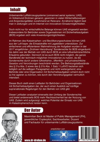 Unbemannte Luftfahrzeugsysteme (unmanned aerial systems- UAS), im Volksmund Drohnen genannt, gewinnen in vielen Wirtschaftszweigen und Anwendungsfällen zunehmend an Relevanz. Annähernd täglich liest man in Zeitungen und im Internet von innovativen Einsatzmöglichkeiten. Doch nicht nur für wirtschaftliche Belange können UAS eingesetzt werden: Insbesondere für Behörden sowie Organisationen mit Sicherheitsaufgaben (BOS) ergeben sich viele Anwendungsmöglichkeiten. Im Rahmen des Katastrophen- und Bevölkerungsschutzes können UAS aus der Luft bspw. die Einsatzkräfte mit Lagebildern unterstützen. Zur einfacheren und effizienteren Wahrnehmung der Aufgaben wurden in der 2017 eingeführten Drohnen-Verordnung Sonderrechte für BOS eingeräumt- bis dahin war der Betrieb von UAS durch BOS an eine luftverkehrsrechtliche Erlaubnis gebunden. Dennoch ist es auch BOS nicht möglich, die ganze Bandbreite der technisch-möglichen Innovationen zu nutzen, da die Sonderrechte durch andere luftverkehrs-, öffentlich- und privatrechtliche Gesetze und Verordnungen beschränkt werden. Die Befreiungstatbestände des Paragraphen 21a Abs. 2 sowie 21b Abs. 1 Satz 1 LuftVO beziehen sich lediglich auf die selbigen Paragraphen und nicht weitergehend; eine Behörde oder eine Organisation mit Sicherheitsaufgaben scheint doch nicht so frei agieren zu können, wie durch den Verordnungsgeber vermutlich intendiert. Es handelt sich bei diesem Buch um einen Leitfaden für Behörden und Organisationen mit Sicherheitsaufgaben, der auch einen Ausblick auf künftige supranationale Regelungen für den Betrieb von UAS gibt. Dieser Leitfaden analysiert einerseits den Umfang der Sonderrechte und bietet andererseits BOS mehr Rechtssicherheit bei der Nutzung von UAS. Zudem wird aufgezeigt, welches Potential der Einsatz von UAS im Katastrophenschutz leisten kann.