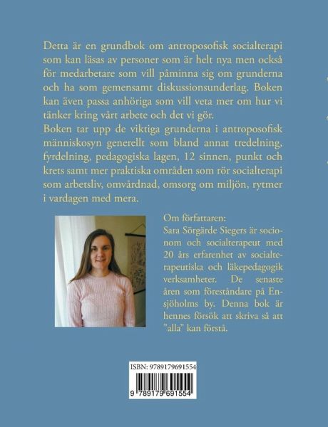 Detta är en grundbok i antroposofisk socialterapi. Den kan läsas av personer som är helt nya till ämnet men också för medarbetare som vill påminna sig om grunderna och ha som gemensamt diskussionsunderlag. Boken kan även passa anhöriga som vill veta lite mer om hur vi tänker kring vårt arbete och det vi gör. Boken tar upp de vanligaste grunderna i antroposofisk människosyn generellt som bland annat tregrening, fyrdelade människa, pedagogiska lagen, 12 sinnen, punkt och krets samt mer praktiska områden som rör socialterapi som arbetsliv, omvårdnad, omsorg om miljön, rytmer i vardagen med mera.