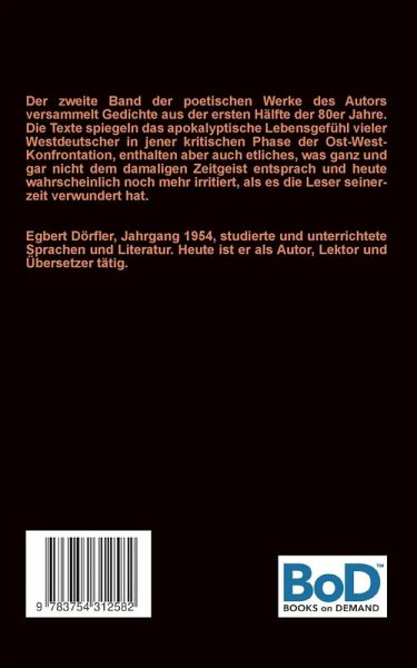 Der zweite Band der poetischen Werke des Autors versammelt Gedichte aus der ersten Hälfte der 80er Jahre. Die Texte spiegeln das apokalyptische Lebensgefühl vieler Westdeutscher in jener kritischen Phase der Ost-West-Konfrontation, enthalten aber auch etliches, was ganz und gar nicht dem damaligen Zeitgeist entsprach und heute wahrscheinlich noch mehr irritiert, als es die Leser seinerzeit verwundert hat.