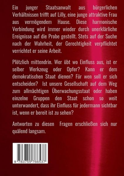 Ein junger Staatsanwalt aus bürgerlichen Verhältnissen trifft auf Lilly, eine junge attraktive Frau aus vermögendem Hause. Diese harmonische Verbindung wird immer wieder durch unerklärliche Ereignisse auf die Probe gestellt. Stets auf der Suche nach der Wahrheit, der Gerechtigkeit verpflichtet verrichtet er seine Arbeit.Plötzlich mittendrin. Wer übt wo Einfluss aus, ist er selber Werkzeug oder Opfer. Kann er dem demokratischen Staat dienen? Für wen soll er sich entscheiden? Ist unsere Gesellschaft auf dem Weg zum allmächtigen Überwachungsstaat oder haben einzelne Gruppen den Staat schon so weit unterwandert, dass ihr Einfluss für jedermann sichtbar ist, wenn er bereit ist zu sehen?Antworten zu diesen Fragen erschließen sich nur quälend langsam.