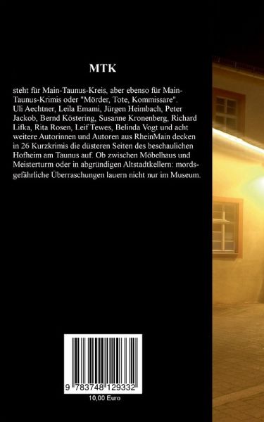 MTK steht für Main-Taunus-Kreis, aber ebenso für Main-Taunus-Krimis oder "Mörder, Tote Kommissare". Uli Aechtner, Leila Emami, Jürgen Heimbach, Peter Jackob, Bernd Köstering, Susanne Kronenberg, Richard Lifka, Rita Rosen, Leif Tewes, Belinda Vogt und acht weitere Autorinnen und Autoren aus RheinMain decken in 26 Kurzkrimis die düsteren Seiten des beschaulichen Hofheim am Taunus auf. Ob zwischen Möbelhaus und Meisterturm oder in abgründigen Altstadtkellern: mordsgefährliche Überraschungen lauern nicht nur im Stadtmuseum.