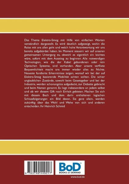 Das Thema Elektro-Smog mit Hilfe von einfachen Worten verständlich dargestellt. Es wird deutlich aufgezeigt, wohin die Reise mit uns allen geht und welch hohe Verantwortung Sie sich selbst bereits aufgebürdet haben. Sofern Sie mobile Geräte zur Kommunikation nutzen. Im Moment steuern wir auf unseren gemeinsamen Untergang zu, obwohl es eigentlich ein leichtes wäre, sofort mit dem Ausstieg zu beginnen. Alle notwendigen Technologien, wie die der Kabel gebundenen oder rein Optischen Systeme, sind vorhanden. Aber unsere verflixte Bequemlichkeit, macht uns immer wieder alles zunichte. Neueste fundierte Erkenntnisse zeigen, worauf wir alle zusteuern, sollten wir der Elektro-Smog basierenden Mobilität nicht sofort Einhalt gebieten. Die schier unglaublichen Zustände, sowohl beim Gesetzgeber als bei der Industrie, werden schonungslos aufgedeckt, zur Debatte gebracht und beim Namen genannt. Es liegt an uns allen, insbesondere an jedem selbst, hier und jetzt eine Entscheidung zu treffen. Sein oder Nichtsein sind die zwei Optionen, die uns noch zur Verfügung stehen. Ein zwischendrin gibt es schon seit Jahren nicht mehr, da der von uns ausgelöste Massenhype zum Handy, fast alles Positive dazu bereits verhindert hat. Bitte bedenken Sie eines vorweg: Die Lage ist nicht erst seit der geplanten Einführung von 5G mehr als nur kritisch. Machen Sie sich mit diesem Buch und dem darin enthaltenen Wissen selbst ein Bild davon. Sie ganz allein, sollten für das Wohl und Wehe von sich und anderen entscheiden.Ihr Heinrich Schmid