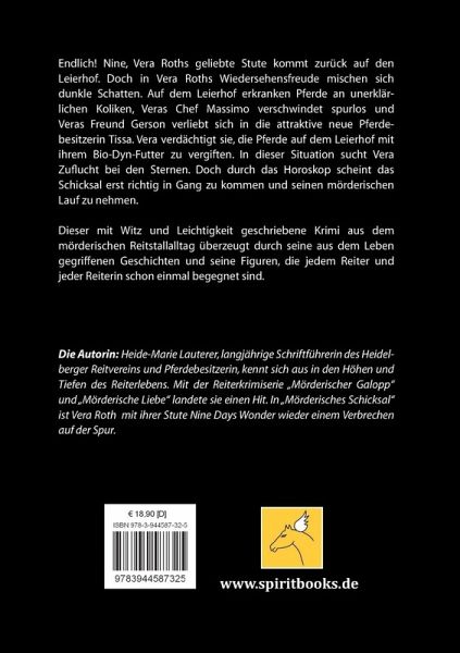 Endlich! Nine, Vera Roths geliebte Stute kommt zurück auf den Leierhof. Doch in Vera Roths Wiedersehensfreude mischen sich dunkle Schatten. Auf dem Leierhof erkranken Pferde an unerklärlichen Koliken, Veras Chef Massimo verschwindet spurlos und Veras Freund Gerson verliebt sich in die attraktive neue Pferdebesitzerin Tissa. Vera verdächtigt sie, die Pferde auf dem Leierhof mit ihrem Bio-Dyn-Futter zu vergiften. In dieser Situation sucht Vera Zuflucht bei den Sternen. Doch durch das Horoskop scheint das Schicksal erst richtig in Gang zu kommen und seinen mörderischen Lauf zu nehmen. Dieser mit Witz und Leichtigkeit geschriebene Krimi aus dem mörderischen Reitstallalltag überzeugt durch seine aus dem Leben gegriffenen Geschichten und seine Figuren, die jedem Reiter und jeder Reiterin schon einmal begegnet sind.