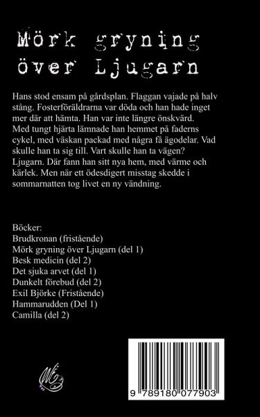 Mörk gryning över Ljugarn Hans stod ensam på gårdsplan. Flaggan vajade på halv stång. Fosterföräldrarna var döda och han hade inget mer där att hämta. Han var inte längre önskvärd. Med tungt hjärta lämnade han hemmet på faderns cykel, med väskan packad med några få ägodelar. Vad skulle han ta sig till. Vart skulle han ta vägen? Ljugarn. Där fann han sitt nya hem, med värme och kärlek. Men när ett ödesdigert misstag skedde i sommarnatten tog livet en ny vändning. Böcker: Brudkronan (fristående) Mörk gryning över Ljugarn (del 1) Besk medicin (del 2) Det sjuka arvet (del 1) Dunkelt förebud (del 2) Exil Björke (Fristående) Hammarudden (Del 1) Camilla (del 2)