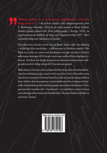 "Mörkrets makter är en av de största upptäckterna i Draculas långa historia..." Så skriver skräck- och vampyrexperten John E. Browning i förordet. Detta är en unik version av Bram Stokers bloddrypande mästerverk. Den publicerades i Sverige 1899, en tegelstensroman dubbelt så lång som klassikern från 1897. Men också betydligt mer våldsam och erotisk. Det råder inte mycket tvivel om att Bram Stoker själv var delaktig -- avsiktligt eller oavsiktligt -- i tillkomsten av Mörkrets makter. Här finns ett myller av scener och karaktärer som går att hitta i Stokers arbetsanteckningar till Dracula, men som ströks till den slutliga versionen. Forskare har dragit slutsatsen att denna svenska roman redigerades med ett tidigt utkast till Dracula som grund. Den översattes sedan till isländska i en drastiskt förkortad och urvattnad version, Makt myrkranna -- men detta är alltså originalet! Både fans av Dracula och nya läsare får här en mycket annorlunda berättelse att fördjupa sig i, med ett helt nytt slut. Greve Draculitz (som han heter i romanen) har inte bara för avsikt att sprida vampyrsläktet över världen; han konspirerar med makthavare för att skapa en fascistisk världsordning där hedniska gudar ska dyrkas i blodsriter. Och i grevens slott vandrar den "vita damen", en underbart vacker kvinna som ständigt söker locka advokatbiträdet Thomas Harker i fördärvet med sina "kyssar".