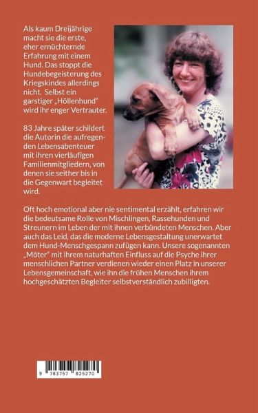 Als kaum Dreijährige, im Jahre 1940, macht die Autorin die erste, eher ernüchternde Erfahrung mit einem Hund. Das stoppt die Hundebegeisterung des Kriegskindes allerdings nicht. Die kleine Helga betrachtet die Hunde, mit denen sie es zu tun bekommt, als gleichwertige und ersehnte Partner und entwickelt zu ihnen eine tiefere emotionale Bindung als zu irgend einem anderen Wesen in der neugierig kontaktierten Tierwelt. Selbst ein garstiger Höllenhund wird damals ihr enger Vertrauter. 83 Jahre später schildert die Autorin in den sogenannten Mötergeschichten die aufregenden Lebensabenteuer mit ihren vierläufigen Begleitern und Familienmitgliedern, die bis in die Gegenwart reichen. Ihre Erlebniserzählungen umspannen einen Rahmen von den ersten Laufversuchen ihrer Kinder mit Hilfe der Hunde bis zum Einsatz als Wildhüterin mit ihrem Dienst-Hund ODY am Naturschutzgebiet, in dem auch die sogenannten Grauen Brüder,- unsere Wölfe zuhause sind. In lebensnahen aktuellen Bereichen der Hundehaltung hat die Autorin sich engagiert und qualifiziert. (z.B. als zertifizierte Ausbilderin und Prüferin für den Hundeführerschein, als Internationale Spezial-Zuchtrichterin für Rhodesian Ridgebacks, als geprüfte Jagdaufseherin usw.)