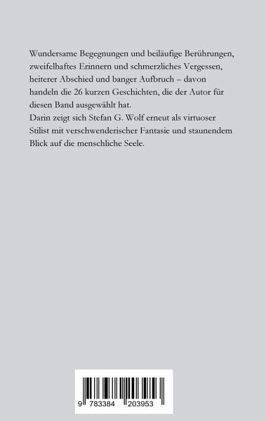Wundersame Begegnungen und beiläufige Berührungen, zweifelhaftes Erinnern und schmerzliches Vergessen, heiterer Abschied und banger Aufbruch - davon handeln die 26 kurzen Geschichten, die der Autor für diesen Band ausgewählt hat. Darin zeigt sich Stefan G. Wolf erneut als virtuoser Stilist mit verschwenderischer Fantasie und staunendem Blick auf die menschliche Seele.