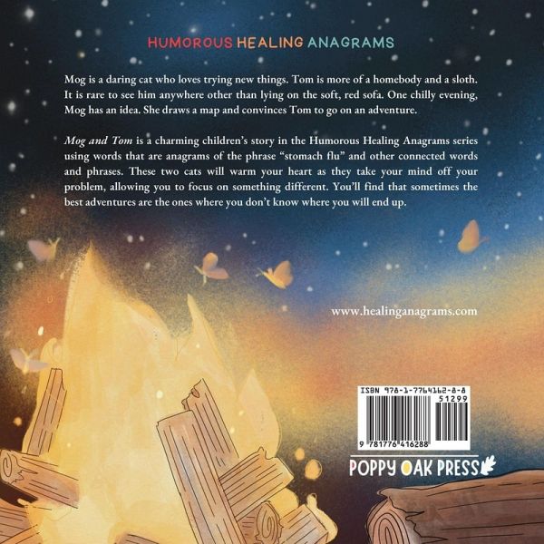 Mog is a daring cat who loves trying new things. Tom is more of a homebody and a sloth. It is rare to see him anywhere other than lying on the soft, red sofa. One chilly evening, Mog has an idea. She draws a map and convinces Tom to go on an adventure. Mog and Tom is a charming children's story in the Humorous Healing Anagrams series using words that are anagrams of the phrase "stomach flu" and other connected words and phrases. These two cats will warm your heart as they take your mind off your problem, allowing you to focus on something different. You'll find that sometimes the best adventures are the ones where you don't know where you will end up. At the end of the book is a list of the anagram words used to create this story. Children are encouraged to write their own fun stories using this list of words.