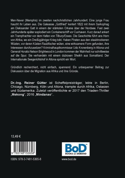 Men-Never (Memphis) im zweiten nachchristlichen Jahrhundert: Eine junge Frau haucht ihr Leben aus. Die Galeasse "Gottfried" kentert 1822 mit ihrem Sarkophag am Dieksander Gatt in einem der stärksten Orkane über der Nordsee. Fast zwei Jahrhunderte später explodiert ein Containerschiff vor Cuxhaven. Kurz darauf ankert ein Trampfrachter vor dem Hafen von Tilbury/Essex. Die Geschichte führt ans Horn von Afrika, wo ein Dreißigjähriger Krieg tobt. Haben Piraten aus den staubtrockenen Wüsten, vor deren Küsten Raubfischer wüten, eine wirksamere Form gefunden, ihre Interessen durchzusetzen? Kriminalhauptkommissar Udo Kronenberg in Altona und General Horatio Nelson Brightwood in London kommen der Wahrheit nur schrittweise auf die Spur. Sie verhandeln mit einem dubiosen Sheikh aus Somaliland. Der Internationale Seegerichtshof in Altona spricht ein Wort.Gründlich recherchiert, nicht einfach, spannend. Ein unbequemer Beitrag zur Diskussion über die Migration aus Afrika und ihre Gründe.