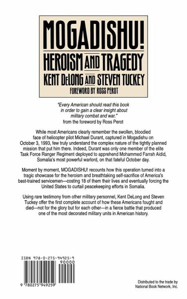 Every American should read this book in order to gain a clear insight about military combat and war. From the foreword by Ross Perot Recommended for readers who enjoy suspenseful accounts of close combat. Publishers Weekly Most Americans remember.the two troubling televised images that follwed [the operation]..But there is more about that day that is told in this book and that should be known by Americans. The Wall Street Journal Among America's clearest memories of ongoing conflict in Somalia will certainly be the swollen, bloodied face of helicopter pilot Michael Durant, displayed on the international television news reports after his capture in Mogadishu on October 3, 1993. While the failed mission leading to Durant's imprisonment captured the rage and anguish of the world, few Americans truly understood how many U.S. Army Ranger compatriots shared Durant's fortitude and courage there. Indeed, Durant was only one member of the elite Task Force Ranger Regiment deployed to apprehend Mohammed Farrah Aidid, Somailia's most powerful warlord on the fateful October day. Here is the little-known story of the 15 fierce, deadly hours of fighting that followed the Americans tightly calibrated attempt to target Aidid. Moment by moment, Mogahishu! recounts how this mission, intended to deflate the heart of Somali resistance, became instead a tragic showcase for the heroism and breathtaking self-sacrifice of the American servicement--and the catalyst of U.S. withdrawal of peacekeeping troops. Mogadishu! reveals while the operation produced on the most decorated military units in American history, it cost 18 of America's best-trained servicemen their lives. Using rare testimony from other military personnel, Kent DeLong offers the first complete account of how these Americans died, not for glory but for each other, far from their loved ones in a God-forsaken place called Mogadishu.