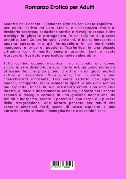 Sedotta nel Peccato - Romanzo Erotico con Sesso Esplicito - per Adulti, scritto da Lara Steele, è un'esplosiva storia di desiderio represso, seduzione sottile e risveglio sessuale che travolge la giovane protagonista in un turbine di piacere proibito. Lori Callan ha solo vent'anni, è bella, innocente e appena sposata, ma già intrappolata in un matrimonio monotono e privo di passione. Trasferitasi in una piccola cittadina con il marito sempre assente, Lori si sente trascurata, frustrata e pericolosamente vulnerabile. Tutto cambia quando incontra i vicini: Linda, una donna sicura di sé e disinibita, e suo marito Art, un uomo maturo e affascinante, che pian piano la attira in un gioco erotico sottile e irresistibile. Ogni giorno, tra un caffè e una chiacchierata innocente, Lori viene sedotta con sguardi audaci, accappatoi maliziosamente aperti e allusioni sempre più esplicite, finché la sua resistenza crolla. Con uno stile diretto, audace e intensamente sensuale, Sedotta nel Peccatoesplora il risveglio carnale di una giovane donna che, da timida e inesperta, scopre il potere del suo corpo e il piacere della trasgressione. Una lettura pensata per adulti che cercano emozioni forti, scene di sesso esplicito e una narrazione che stimola l'immaginazione e accende i sensi.