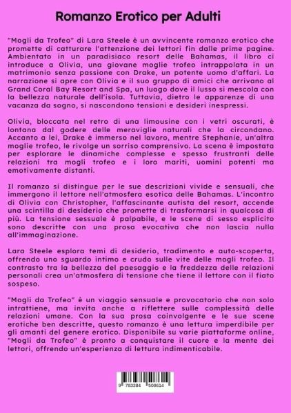 "Mogli da Trofeo" di Lara Steele è un avvincente romanzo erotico che promette di catturare l'attenzione dei lettori fin dalle prime pagine. Ambientato in un paradisiaco resort delle Bahamas, il libro ci introduce a Olivia, una giovane moglie trofeo intrappolata in un matrimonio senza passione con Drake, un potente uomo d'affari. La narrazione si apre con Olivia e il suo gruppo di amici che arrivano al Grand Coral Bay Resort and Spa, un luogo dove il lusso si mescola con la bellezza naturale dell'isola. Tuttavia, dietro le apparenze di una vacanza da sogno, si nascondono tensioni e desideri inespressi.Olivia, bloccata nel retro di una limousine con i vetri oscurati, è lontana dal godere delle meraviglie naturali che la circondano. Accanto a lei, Drake è immerso nel lavoro, mentre Stephanie, un'altra moglie trofeo, le rivolge un sorriso comprensivo. La scena è impostata per esplorare le dinamiche complesse e spesso frustranti delle relazioni tra mogli trofeo e i loro mariti, uominipotenti ma emotivamente distanti.Il romanzo si distingue per le sue descrizioni vivide e sensuali, che immergono il lettore nell'atmosfera esotica delle Bahamas. L'incontro di Olivia con Christopher, l'affascinante autista del resort, accende una scintilla di desiderio che promette di trasformarsi in qualcosa di più. La tensione sessuale è palpabile, e le scene di sesso esplicito sono descritte con una prosa evocativa che non lascia nulla all'immaginazione.Lara Steele esplora temi di desiderio, tradimento e auto-scoperta, offrendo uno sguardo intimo e crudo sulle vite delle mogli trofeo. Il contrasto tra la bellezza del paesaggio e la freddezza delle relazioni personali crea un'atmosfera di tensione che tiene il lettore con il fiato sospeso."Mogli da Trofeo" è un viaggio sensuale e provocatorio che non solo intrattiene, ma invita anche a riflettere sulle complessità delle relazioni umane. Con la sua prosa coinvolgente e le sue scene erotiche ben descritte, questo romanzo è una lettura imperdibile per gli amanti del genere erotico. Disponibile su varie piattaforme online, "Mogli da Trofeo" è pronto a conquistare il cuore e la mente dei lettori, offrendo un'esperienza di lettura indimenticabile.