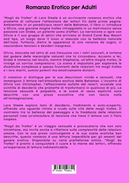 "Mogli da Trofeo" di Lara Steele è un avvincente romanzo erotico che promette di catturare l'attenzione dei lettori fin dalle prime pagine. Ambientato in un paradisiaco resort delle Bahamas, il libro ci introduce a Olivia, una giovane moglie trofeo intrappolata in un matrimonio senza passione con Drake, un potente uomo d'affari. La narrazione si apre con Olivia e il suo gruppo di amici che arrivano al Grand Coral Bay Resort and Spa, un luogo dove il lusso si mescola con la bellezza naturale dell'isola. Tuttavia, dietro le apparenze di una vacanza da sogno, si nascondono tensioni e desideri inespressi.Olivia, bloccata nel retro di una limousine con i vetri oscurati, è lontana dal godere delle meraviglie naturali che la circondano. Accanto a lei, Drake è immerso nel lavoro, mentre Stephanie, un'altra moglie trofeo, le rivolge un sorriso comprensivo. La scena è impostata per esplorare le dinamiche complesse e spesso frustranti delle relazioni tra mogli trofeo e i loro mariti, uominipotenti ma emotivamente distanti.Il romanzo si distingue per le sue descrizioni vivide e sensuali, che immergono il lettore nell'atmosfera esotica delle Bahamas. L'incontro di Olivia con Christopher, l'affascinante autista del resort, accende una scintilla di desiderio che promette di trasformarsi in qualcosa di più. La tensione sessuale è palpabile, e le scene di sesso esplicito sono descritte con una prosa evocativa che non lascia nulla all'immaginazione.Lara Steele esplora temi di desiderio, tradimento e auto-scoperta, offrendo uno sguardo intimo e crudo sulle vite delle mogli trofeo. Il contrasto tra la bellezza del paesaggio e la freddezza delle relazioni personali crea un'atmosfera di tensione che tiene il lettore con il fiato sospeso."Mogli da Trofeo" è un viaggio sensuale e provocatorio che non solo intrattiene, ma invita anche a riflettere sulle complessità delle relazioni umane. Con la sua prosa coinvolgente e le sue scene erotiche ben descritte, questo romanzo è una lettura imperdibile per gli amanti del genere erotico. Disponibile su varie piattaforme online, "Mogli da Trofeo" è pronto a conquistare il cuore e la mente dei lettori, offrendo un'esperienza di lettura indimenticabile.