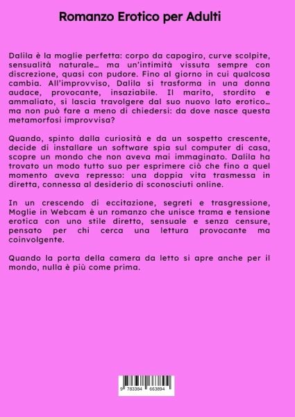 Dalila è la moglie perfetta: corpo da capogiro, curve scolpite, sensualità naturale... ma un'intimità vissuta sempre con discrezione, quasi con pudore. Fino al giorno in cui qualcosa cambia. All'improvviso, Dalila si trasforma in una donna audace, provocante, insaziabile. Il marito, stordito e ammaliato, si lascia travolgere dal suo nuovo lato erotico... ma non può fare a meno di chiedersi: da dove nasce questa metamorfosi improvvisa?Quando, spinto dalla curiosità e da un sospetto crescente, decide di installare un software spia sul computer di casa, scopre un mondo che non aveva mai immaginato. Dalila ha trovato un modo tutto suo per esprimere ciò che fino a quel momento aveva represso: una doppia vita trasmessa in diretta, connessa al desiderio di sconosciuti online.In un crescendo di eccitazione, segreti e trasgressione, Moglie in Webcam è un romanzo che unisce trama e tensione erotica con uno stile diretto, sensuale e senza censure, pensato per chi cerca una lettura provocante ma coinvolgente.Quando la porta della camera da letto si apre anche per il mondo, nulla è più come prima.