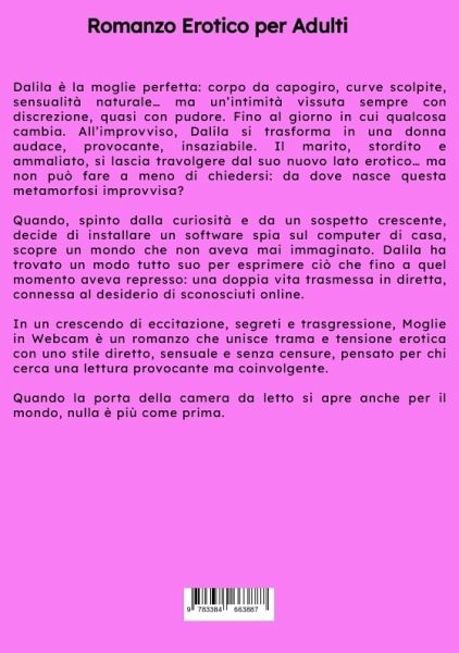 Dalila è la moglie perfetta: corpo da capogiro, curve scolpite, sensualità naturale... ma un'intimità vissuta sempre con discrezione, quasi con pudore. Fino al giorno in cui qualcosa cambia. All'improvviso, Dalila si trasforma in una donna audace, provocante, insaziabile. Il marito, stordito e ammaliato, si lascia travolgere dal suo nuovo lato erotico... ma non può fare a meno di chiedersi: da dove nasce questa metamorfosi improvvisa?Quando, spinto dalla curiosità e da un sospetto crescente, decide di installare un software spia sul computer di casa, scopre un mondo che non aveva mai immaginato. Dalila ha trovato un modo tutto suo per esprimere ciò che fino a quel momento aveva represso: una doppia vita trasmessa in diretta, connessa al desiderio di sconosciuti online.In un crescendo di eccitazione, segreti e trasgressione, Moglie in Webcam è un romanzo che unisce trama e tensione erotica con uno stile diretto, sensuale e senza censure, pensato per chi cerca una lettura provocante ma coinvolgente.Quando la porta della camera da letto si apre anche per il mondo, nulla è più come prima.