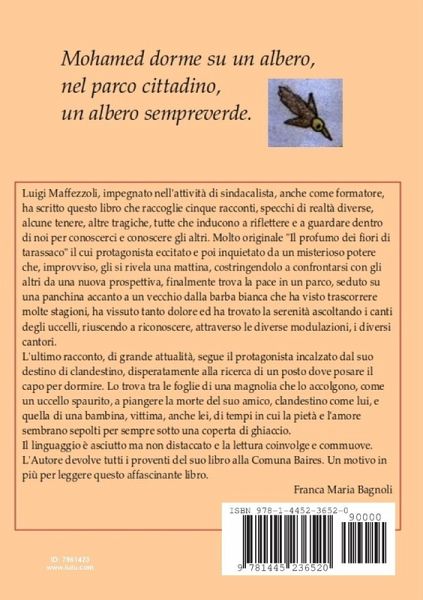 Luigi Maffezzoli, impegnato nell'attività di sindacalista, anche come formatore, ha scritto questo libro che raccoglie cinque racconti, specchi di realtà diverse, alcune tenere, altre tragiche, tutte che inducono a riflettere e a guardare dentro di noi per conoscerci e conoscere gli altri. Molto originale "Il profumo dei fiori di tarassaco" il cui protagonista eccitato e poi inquietato da un misterioso potere che, improvviso, gli si rivela una mattina, costringendolo a confrontarsi con gli altri da una nuova prospettiva, finalmente trova la pace in un parco, seduto su una panchina accanto ad un vecchio dalla barba bianca che ha visto trascorrere molte stagioni, ha vissuto tanto dolore ed ha trovato la serenità ascoltando i canti degli uccelli, riuscendo a riconoscere. attraverso le diverse modulazioni, i diversi cantori. (Franca Maria Bagnoli)