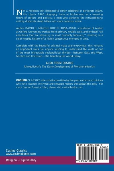 Not a religious text designed to either celebrate or denigrate Islam, this classic biography looks at Mohammed as a towering figure of culture and politics, a man who achieved the extraordinary: uniting disparate Arab tribes into more cohesive whole. Author DAVID S. MARGOLIOUTH (1858-1940), a professor of Arabic at Oxford University, worked from primary Arabic texts and omitted "all anecdotes that are obviously or most probably fabulous," resulting in a clear-headed history of a highly contentious moment in time. It remains an important work for anyone wishing to understand the roots of one of the most intractable sociopolitical divides-between East and West, Muslim and Christian-still haunting the world today. __________________________ ALSO FROM COSIMO Margoliouth's The Early Development of Mohammedanism