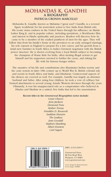 Mohandas K. Gandhi, known as Mahatma (great soul) Gandhi, is a revered figure worldwide for his nonviolent action to free India from British rule. His iconic status endures in the United States, through his influence on Martin Luther King, Jr., and in popular culture, including quotations, a blockbuster film, and interest in Hindu spirituality and practices. Readers will discover how Gandhi came to be a member of the exalted pantheon of men for the ages. They will follow him from his family's home in the provinces to an early arranged marriage, solo sojourn in England to prepare for a law career, and growth from a timid new barrister in South Africa to India's foremost negotiator with the British power structure. He is shown evolving from a loyal British subject to become the champion of Home Rule for India-often inciting illegal actions to get himself and his supporters arrested to futher the cause, and risking his life with his famous hunger strikes. The narrative of Gandhi's life and contributions also illuminates Indian society and the caste system from the latter half of the 19th century up to World War II, including British colonial rule, racism in South Africa and India, and Hinduism. Controversial aspects of Gandhi's choices are covered as well. For example, he was largely an absentee husband and father. After siring four children, he took a vow of celibacy, but nevertheless formed attachments to several young, female Western devotees through the years. Ultimately, it was Gandhi's role as a compromiser who believed in Hindus and Muslims in a free, united India that led to his assassination.