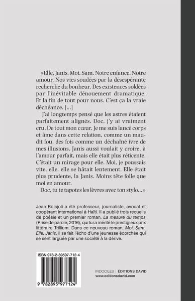 « Elle, Janis. Moi, Sam. Notre enfance. Notre amour. Nos vies soudées par la désespérante recherche du bonheur. Des existences soldées par l’inévitable dénouement dramatique. Et la fin de tout pour nous. C’est ça la vraie déchéance. […] J’ai longtemps pensé que les astres étaient parfaitement alignés. Doc, j’y ai vraiment cru. De tout mon cœur. Je me suis lancé corps et âme dans cette relation, comme un maudit fou, des fois comme un déchaîné ivre de mes illusions. Janis aussi voulait y croire, à l’amour parfait, mais elle était plus réticente. C’était un mirage pour elle. Moi, je poussais vite, elle, elle se hâtait lentement. Elle était plus prudente, la Janis. Moins tête folle que moi en amour. Doc, tu te tapotes les lèvres avec ton stylo… »