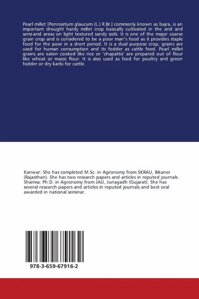 Pearl millet [Pennisetum glaucum (L.) R.Br.] commonly known as bajra, is an important drought hardy millet crop basically cultivated in the arid and semi-arid areas on light textured sandy soils. It is one of the major coarse grain crop and is considered to be a poor man's food as it provides staple food for the poor in a short period. It is a dual purpose crop, grains are used for human consumption and its fodder as cattle feed. Pearl millet grains are eaten cooked like rice or 'chapattis' are prepared out of flour like wheat or maize flour. It is also used as feed for poultry and green fodder or dry karbi for cattle.