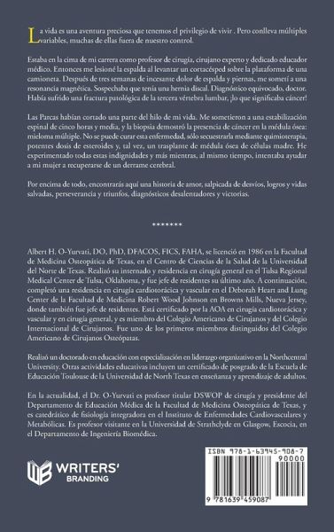 Sinopsis: La vida es una aventura preciosa que tenemos el privilegio de vivir. Pero conlleva múltiples variables, muchas de ellas fuera de nuestro control. Estaba en la cima de mi carrera como profesor de cirugía, cirujano experto y dedicado educador médico. Entonces me lesioné la espalda al levantar un cortacésped sobre la plataforma de una camioneta. Después de tres semanas de incesante dolor de espalda y piernas, me sometí a una resonancia magnética. Sospechaba que tenía una hernia discal. Diagnóstico equivocado, doctor. Había sufrido una fractura patológica de la tercera vértebra lumbar, ¡lo que significaba cáncer! Las Parcas habían cortado una parte del hilo de mi vida. Me sometieron a una estabilización espinal de cinco horas y media, y la biopsia demostró la presencia de cáncer en la médula ósea: mieloma múltiple. No se puede curar esta enfermedad, sólo secuestrarla mediante quimioterapia, potentes dosis de esteroides y, tal vez, un trasplante de médula ósea de células madre. He experimentado todas estas indignidades y más mientras, al mismo tiempo, intentaba ayudar a mi mujer a recuperarse de un derrame cerebral. Por encima de todo, encontrarás aquí una historia de amor, salpicada de desvíos, logros y vidas salvadas, perseverancia y triunfos, diagnósticos desalentadores y victorias. Autobiografía: Albert H. O-Yurvati, DO, PhD, DFACOS, FICS, FAHA, se licenció en 1986 en la Facultad de Medicina Osteopática de Texas, en el Centro de Ciencias de la Salud de la Universidad del Norte de Texas. Realizó su internado y residencia en cirugía general en el Tulsa Regional Medical Center de Tulsa, Oklahoma, y fue jefe de residentes su último año. A continuación, completó una residencia en cirugía cardiotorácica y vascular en el Deborah Heart and Lung Center de la Facultad de Medicina Robert Wood Johnson en Browns Mills, Nueva Jersey, donde también fue jefe de residentes. Está certificado por la AOA en cirugía cardiotorácica y vascular y en cirugía general, y es miembro del Colegio Americano de Cirujanos y del Colegio Internacional de Cirujanos. Fue uno de los primeros miembros distinguidos del Colegio Americano de Cirujanos Osteópatas. Realizó un doctorado en educación con especialización en liderazgo organizativo en la Northcentral University. Otras actividades educativas incluyen un certificado de posgrado de la Escuela de Educación Toulouse de la Universidad de North Texas en enseñanza y aprendizaje de adultos. En la actualidad, el Dr. O-Yurvati es profesor titular DSWOP de cirugía y presidente del Departamento de Educación Médica de la Facultad de Medicina Osteopática de Texas, y es catedrático de fisiología integradora en el Instituto de Enfermedades Cardiovasculares y Metabólicas. Es profesor visitante en la Universidad de Strathclyde en Glasgow, Escocia, en el Departamento de Ingeniería Biomédica.