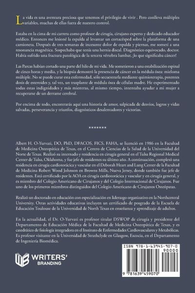 Sinopsis: La vida es una aventura preciosa que tenemos el privilegio de vivir. Pero conlleva múltiples variables, muchas de ellas fuera de nuestro control. Estaba en la cima de mi carrera como profesor de cirugía, cirujano experto y dedicado educador médico. Entonces me lesioné la espalda al levantar un cortacésped sobre la plataforma de una camioneta. Después de tres semanas de incesante dolor de espalda y piernas, me sometí a una resonancia magnética. Sospechaba que tenía una hernia discal. Diagnóstico equivocado, doctor. Había sufrido una fractura patológica de la tercera vértebra lumbar, ¡lo que significaba cáncer! Las Parcas habían cortado una parte del hilo de mi vida. Me sometieron a una estabilización espinal de cinco horas y media, y la biopsia demostró la presencia de cáncer en la médula ósea: mieloma múltiple. No se puede curar esta enfermedad, sólo secuestrarla mediante quimioterapia, potentes dosis de esteroides y, tal vez, un trasplante de médula ósea de células madre. He experimentado todas estas indignidades y más mientras, al mismo tiempo, intentaba ayudar a mi mujer a recuperarse de un derrame cerebral. Por encima de todo, encontrarás aquí una historia de amor, salpicada de desvíos, logros y vidas salvadas, perseverancia y triunfos, diagnósticos desalentadores y victorias. Autobiografía: Albert H. O-Yurvati, DO, PhD, DFACOS, FICS, FAHA, se licenció en 1986 en la Facultad de Medicina Osteopática de Texas, en el Centro de Ciencias de la Salud de la Universidad del Norte de Texas. Realizó su internado y residencia en cirugía general en el Tulsa Regional Medical Center de Tulsa, Oklahoma, y fue jefe de residentes su último año. A continuación, completó una residencia en cirugía cardiotorácica y vascular en el Deborah Heart and Lung Center de la Facultad de Medicina Robert Wood Johnson en Browns Mills, Nueva Jersey, donde también fue jefe de residentes. Está certificado por la AOA en cirugía cardiotorácica y vascular y en cirugía general, y es miembro del Colegio Americano de Cirujanos y del Colegio Internacional de Cirujanos. Fue uno de los primeros miembros distinguidos del Colegio Americano de Cirujanos Osteópatas. Realizó un doctorado en educación con especialización en liderazgo organizativo en la Northcentral University. Otras actividades educativas incluyen un certificado de posgrado de la Escuela de Educación Toulouse de la Universidad de North Texas en enseñanza y aprendizaje de adultos. En la actualidad, el Dr. O-Yurvati es profesor titular DSWOP de cirugía y presidente del Departamento de Educación Médica de la Facultad de Medicina Osteopática de Texas, y es catedrático de fisiología integradora en el Instituto de Enfermedades Cardiovasculares y Metabólicas. Es profesor visitante en la Universidad de Strathclyde en Glasgow, Escocia, en el Departamento de Ingeniería Biomédica.