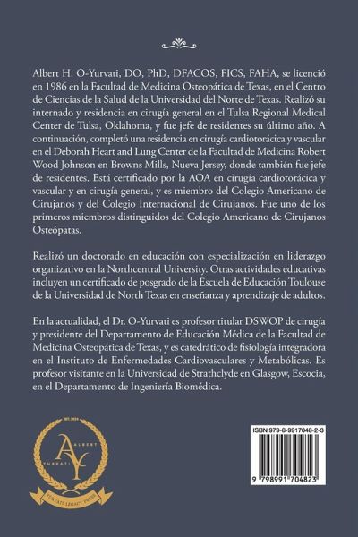 Autobiografía: Albert H. O-Yurvati, DO, PhD, DFACOS, FICS, FAHA, se licenció en 1986 en la Facultad de Medicina Osteopática de Texas, en el Centro de Ciencias de la Salud de la Universidad del Norte de Texas. Realizó su internado y residencia en cirugía general en el Tulsa Regional Medical Center de Tulsa, Oklahoma, y fue jefe de residentes su último año. A continuación, completó una residencia en cirugía cardiotorácica y vascular en el Deborah Heart and Lung Center de la Facultad de Medicina Robert Wood Johnson en Browns Mills, Nueva Jersey, donde también fue jefe de residentes. Está certificado por la AOA en cirugía cardiotorácica y vascular y en cirugía general, y es miembro del Colegio Americano de Cirujanos y del Colegio Internacional de Cirujanos. Fue uno de los primeros miembros distinguidos del Colegio Americano de Cirujanos Osteópatas.Realizó un doctorado en educación con especialización en liderazgo organizativo en la Northcentral University. Otras actividades educativas incluyen un certificado de posgrado de la Escuela de Educación Toulouse de la Universidad de North Texas en enseñanza y aprendizaje de adultos.En la actualidad, el Dr. O-Yurvati es profesor titular DSWOP de cirugía y presidente del Departamento de Educación Médica de la Facultad de Medicina Osteopática de Texas, y es catedrático de fisiología integradora en el Instituto de Enfermedades Cardiovasculares y Metabólicas. Es profesor visitante en la Universidad de Strathclyde en Glasgow, Escocia, en el Departamento de Ingeniería Biomédica.
