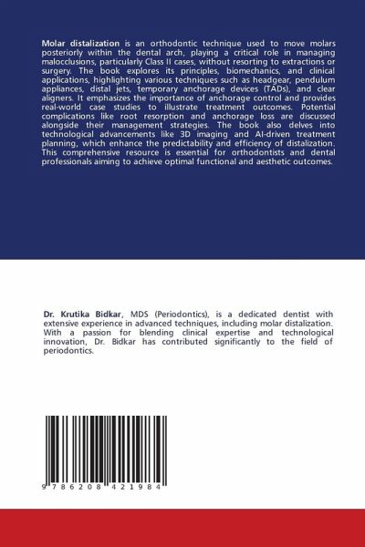 Molar distalization is an orthodontic technique used to move molars posteriorly within the dental arch, playing a critical role in managing malocclusions, particularly Class II cases, without resorting to extractions or surgery. The book explores its principles, biomechanics, and clinical applications, highlighting various techniques such as headgear, pendulum appliances, distal jets, temporary anchorage devices (TADs), and clear aligners. It emphasizes the importance of anchorage control and provides real-world case studies to illustrate treatment outcomes. Potential complications like root resorption and anchorage loss are discussed alongside their management strategies. The book also delves into technological advancements like 3D imaging and AI-driven treatment planning, which enhance the predictability and efficiency of distalization. This comprehensive resource is essential for orthodontists and dental professionals aiming to achieve optimal functional and aesthetic outcomes.
