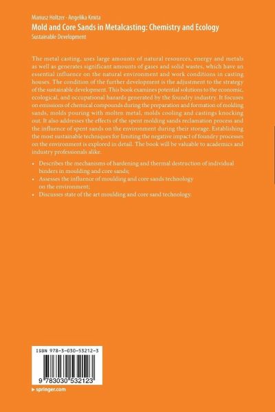The metal casting, uses large amounts of natural resources, energy and metals as well as generates significant amounts of gases and solid wastes, which have an essential influence on the natural environment and work conditions in casting houses. The condition of the further development is the adjustment to the strategy of the sustainable development.This book examines potential solutions to the economic, ecological, and occupational hazards generated by the foundry industry. It focuses on emissions of chemical compounds during the preparation and formation of molding sands, molds pouring with molten metal, molds cooling and castings knocking out. It also addresses the effects of the spent molding sands reclamation process and the influence of spent sands on the environment during their storage. Establishing the most sustainable techniques for limiting the negative impact of foundry processes on the environment is explored in detail. The book will be valuableto academics and industry professionals alike.