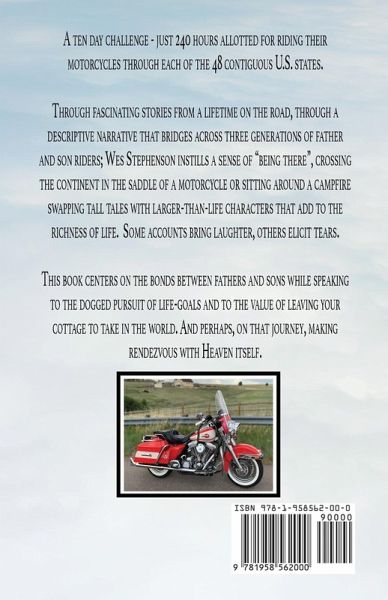 A ten-day challenge - just 240 hours allotted for riding their motorcycles through each of the 48 contiguous U.S. states. Through fascinating stories from a lifetime on the road, through a descriptive narrative that bridges across three generations of father and son riders; Wes Stephenson instills a sense of "being there," crossing the continent in the saddle of a motorcycle or sitting around a campfire swapping tall tales with larger-than-life characters that add to the richness of life. Some accounts bring laughter, others elicit tears. This book centers on the bonds between fathers and sons while speaking to the dogged pursuit of life-goals and to the value of leaving your cottage to take in the world. And perhaps, on that journey, making rendezvous with Heaven itself.