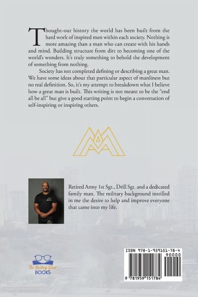 Book synopsis:Thought-out history the world has been built from the hard work of inspired men within each society. Nothing is more amazing than a man who can create with his hands and mind. Building structure from dirt to becoming one of the world's wonders. It's truly something to behold the development of something from nothing.Society has not completed defining or describing a great man. We have some ideas about that particular aspect of manliness but no real definition. So, it's my attempt to breakdown what I believe how a great man is built. This writing is not meant to be the "end all be all" but give a good starting point to begin a conversation of self-inspiring or inspiring others. Author Description: Retired Army 1st Sgt., Drill Sgt. and a dedicated family man. The military background instilled in me the desire to help and improve everyone that came into my life.