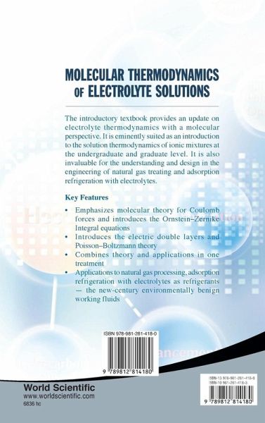 The introductory textbook provides an update on electrolyte thermodynamics with a molecular perspective. It is eminently suited as an introduction to the solution thermodynamics of ionic mixtures at the undergraduate and graduate level. It is also invaluable for the understanding and design in the engineering of natural gas treating and adsorption refrigeration with electrolytes.