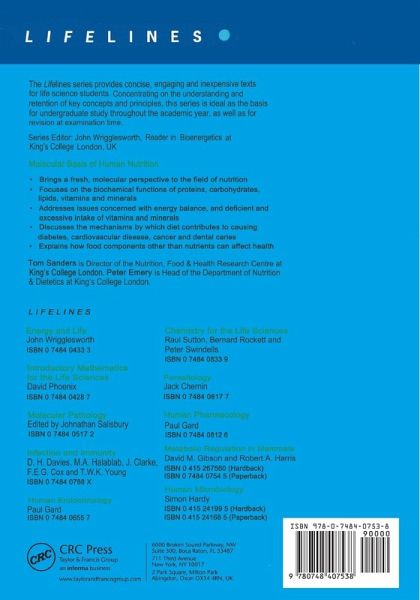 This book focuses mainly on human nutrition and emphasises the molecular and metabolic basis of nutrition to reflect the increasing knowledge and research in these fields. It explains the biochemical functions of the essential nutrients and the physiological consequences of deficient and excessive intakes. These are described within the context of normal human diets and requirements for health. Consideration is also given to the other biologically active materials within foods and to the role of diet in multifactorial diseases. Each chapter addresses a different type of nutrient, such as protein, vitamins and minerals, discussing their structure, breakdown and energy dynamics. Although this book is about human nutrition, in some instances there are comparisons with and examples of other mammalian species to facilitate understanding of the principles being explained. This book is the only one to cover this particular subject and should prove very popular with both students and lecturers alike . Sanders; Tom Kings College, London, UK,Emery; Peter King's College, London, UK,