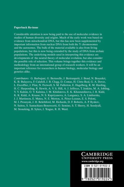 The public is now paying considerable attention to the use of molecular evidence in studies of human diversity and origins. Much of the early work in this area was based on evidence from mitochondrial DNA, but this has now been supplemented by important new information from nuclear DNA from both Y chromosomes and the autosomes. The bulk of the material available is from living populations, but this is being extended by the study of DNA from archaic populations. The underlying models used in interpreting this evidence are based on the neutral theory of molecular evolution, but also consider the possible role of selection. This volume brings together much new evidence and methodology from an international group of scientists.