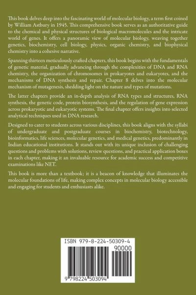 This book delves deep into the fascinating world of molecular biology, a term first coined by William Astbury in 1945. This comprehensive book serves as an authoritative guide to the chemical and physical structures of biological macromolecules and the intricate world of genes. It offers a panoramic view of molecular biology, weaving together genetics, biochemistry, cell biology, physics, organic chemistry, and biophysical chemistry into a cohesive narrative. Spanning thirteen meticulously crafted chapters, this book begins with the fundamentals of genetic material, gradually advancing through the complexities of DNA and RNA chemistry, the organization of chromosomes in prokaryotes and eukaryotes, and the mechanisms of DNA synthesis and repair. Chapter 8 delves into the molecular mechanism of mutagenesis, shedding light on the nature and types of mutations. The latter chapters provide an in-depth analysis of RNA types and structures, RNA synthesis, the genetic code, protein biosynthesis, and the regulation of gene expression across prokaryotic and eukaryotic systems. The final chapter offers insights into selected analytical techniques used in DNA research. Designed to cater to students across various disciplines, this book aligns with the syllabi of undergraduate and postgraduate courses in biochemistry, biotechnology, bioinformatics, life sciences, molecular genetics, and medical genetics, predominantly in Indian educational institutions. It stands out with its unique inclusion of challenging questions and problems with solutions, review questions, and practical application boxes in each chapter, making it an invaluable resource for academic success and competitive examinations like NET. This book is more than a textbook; it is a beacon of knowledge that illuminates the molecular foundations of life, making complex concepts in molecular biology accessible and engaging for students and enthusiasts alike.