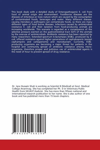 This book deals with a detailed study of Enteropathogenic E. coli from food of animal origin and environment. Foodborne diseases are the diseases of infectious or toxic nature which are caused by the consumption of contaminated foods, beverages and water. Many different disease- causing microbes or pathogens can contaminate foods, so there are many different types of food borne illnesses. Infections caused by antimicrobial resistance E. coli and their isolation from food-producing animals are increasing worldwide. This scenario is regarded as a consequence of the selective pressure exerted on the gastrointestinal tract (GIT) of the animals by the overuse of antimicrobials. Antibiotic resistance has been reported by many researchers. Extended-spectrum b-lactamases (ESBL), produced by E. coli, offered resistance against higher generations of cephalosporin (except cephamycins and carbapenems) and monobactam. Currently, ESBL-producing organisms are becoming a major threat for patients in the hospital and community. spread of antibiotic resistance among micro-organisms, therefore proper and judicious use of antimicrobial agents is the need of hour to prevent spread of drug resistance.