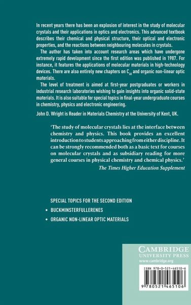 In recent years there has been an explosion of interest in the study of molecular crystals and their applications in optics and electronics. This advanced textbook describes their chemical and physical structure, their optical and electronic properties, and the reactions between neighbouring molecules in crystals. The author has taken into account research areas which have undergone extremely rapid development since the first edition was published in 1987. For instance, it features the applications of molecular materials in high-technology devices. There are also entirely new chapters on C(subscript 60) and organic non-linear optic materials. The level of treatment is aimed at first-year postgraduates or workers in industrial research laboratories wishing to gain insights into organic solid-state materials. It is also suitable for special topics in final-year undergraduate courses in chemistry, physics and electronic engineering.