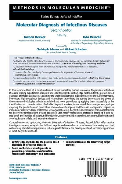 "This work represents one of the most up-to-date molecular biology protocols books to date. . .Anyone who has the interest and resources to develop novel assays not only for infectious diseases but also for other diseases will benefit tremendously from this book. . a valuable purchase to keep as a quick protocol source." -Archives of Pathology and Laboratory Medicine