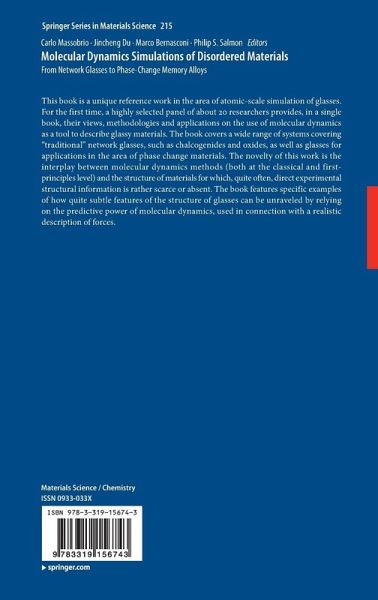 This book is a unique reference work in the area of atomic-scale simulation of glasses. For the first time, a highly selected panel of about 20 researchers provides, in a single book, their views, methodologies and applications on the use of molecular dynamics as a tool to describe glassy materials. The book covers a wide range of systems covering "traditional" network glasses, such as chalcogenides and oxides, as well as glasses for applications in the area of phase change materials. The novelty of this work is the interplay between molecular dynamics methods (both at the classical and first-principles level) and the structure of materials for which, quite often, direct experimental structural information is rather scarce or absent. The book features specific examples of how quite subtle features of the structure of glasses can be unraveled by relying on the predictive power of molecular dynamics, used in connection with a realistic description of forces.