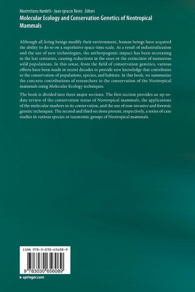 Although all living beings modify their environment, human beings have acquired the ability to do so on a superlative space-time scale. As a result of industrialization and the use of new technologies, the anthropogenic impact has been increasing in the last centuries, causing reductions in the sizes or the extinction of numerous wild populations. In this sense, from the field of conservation genetics, various efforts have been made in recent decades to provide new knowledge that contributes to the conservation of populations, species, and habitats. In this book, we summarize the concrete contributions of researchers to the conservation of the Neotropical mammals using Molecular Ecology techniques. The book is divided into three major sections. The first section provides an up-to-date review of the conservation status of Neotropical mammals, the applications of the molecular markers in its conservation, and the use of non-invasive and forensic genetic techniques. The secondand third sections present, respectively, a series of case studies in various species or taxonomic groups of Neotropical mammals.