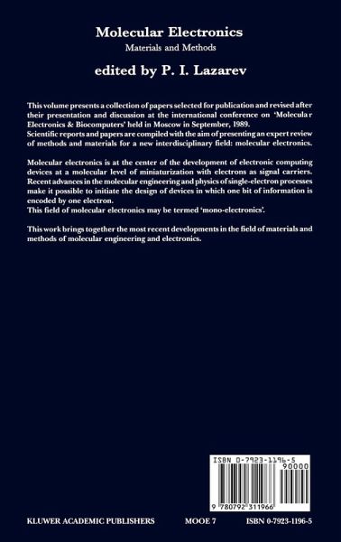 General Subjects.- The role of theory in molecular electronics.- Theoretical Basis of Monoelectronic Input/Output Devices.- Correlated single-electron tunneling via ultrasmall metal particle.- Tunnel electron current dependence on voltage in molecular bridge.- Electronic Properties of Molecular Materials.- Models of extended electron states in proteins.- Electronic instabilities in biological information processing.- Current-voltage characteristics of the bacteriorhodopsin.- Metal to metal intramolecular electron transfer across peptide and protein bridges.- The immobilization of horse radish peroxidase on metal surface.- A Raman spectroscopic study of microtubule protein.- Distant electron transfer in proteins. The role of electrostatic interactions and histidine residues in the electron transfer from myoglobin to cytochrome C.- Molecular Engineering and Molecular Films.- Conducting Langmuir-Blodgett films of mixture of hexadecylbis (ethylenedithio)-TTF and hexadecyl-TCNQ.- Langmuir-Blodgett superlattices, their structure and methods of production.- On the possible use of molecular films for recording and storing information.- Phthalocyanine thin films for molecular electronics.- New highly precise and well defined Langmuir-Blodgett film deposition system.- Monolayer assemblies in the search for ways to engineer on the molecular level.- Solvent permittivity dispersion electrostatic model better fit kinetic data.- X-ray photoelectron spectroscopy study of surface protein orientation.- The new bilayer lipid membrane system: prospects for applications in biomolecular electronic devices.- Neuronet-Like Architecture and New Approaches Computation.- Adaptive behavior in sub-neural microtubule automata.- Spatio-temporal behavior and 1/f-type spectrum of alpha rhythm in brainwave.- Molecular control network.- Fields and vision.- On the biophysical structure of brain-like biocomputers.- Experimental analysis of mechanisms of information fixation by means of molecular neuroprocessor.- Molecular-level neuroelectronics.- Biosensors.- Micro electromechanical actuators based on conducting polymers.- Does nature utilize a common design for photoactive transport and sensor proteins?.- Biosensors and information processes: present state and future projects.- General principles of creating biosensing units based on double-stranded nucleic acid liquid crystals.