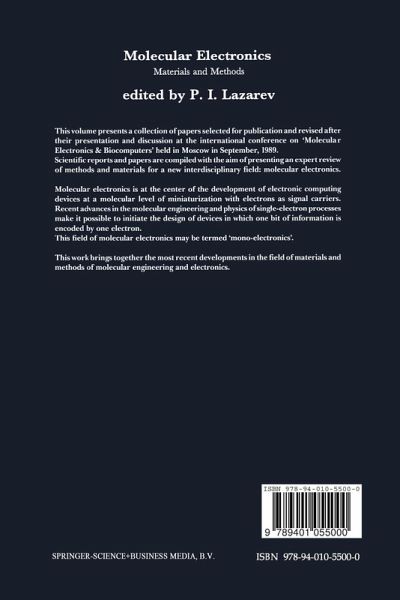 General Subjects.- The role of theory in molecular electronics.- Theoretical Basis of Monoelectronic Input/Output Devices.- Correlated single-electron tunneling via ultrasmall metal particle.- Tunnel electron current dependence on voltage in molecular bridge.- Electronic Properties of Molecular Materials.- Models of extended electron states in proteins.- Electronic instabilities in biological information processing.- Current-voltage characteristics of the bacteriorhodopsin.- Metal to metal intramolecular electron transfer across peptide and protein bridges.- The immobilization of horse radish peroxidase on metal surface.- A Raman spectroscopic study of microtubule protein.- Distant electron transfer in proteins. The role of electrostatic interactions and histidine residues in the electron transfer from myoglobin to cytochrome C.- Molecular Engineering and Molecular Films.- Conducting Langmuir-Blodgett films of mixture of hexadecylbis (ethylenedithio)-TTF and hexadecyl-TCNQ.- Langmuir-Blodgett superlattices, their structure and methods of production.- On the possible use of molecular films for recording and storing information.- Phthalocyanine thin films for molecular electronics.- New highly precise and well defined Langmuir-Blodgett film deposition system.- Monolayer assemblies in the search for ways to engineer on the molecular level.- Solvent permittivity dispersion electrostatic model better fit kinetic data.- X-ray photoelectron spectroscopy study of surface protein orientation.- The new bilayer lipid membrane system: prospects for applications in biomolecular electronic devices.- Neuronet-Like Architecture and New Approaches Computation.- Adaptive behavior in sub-neural microtubule automata.- Spatio-temporal behavior and 1/f-type spectrum of alpha rhythm in brainwave.- Molecular control network.- Fields and vision.- On the biophysical structure of brain-like biocomputers.- Experimental analysis of mechanisms of information fixation by means of molecular neuroprocessor.- Molecular-level neuroelectronics.- Biosensors.- Micro electromechanical actuators based on conducting polymers.- Does nature utilize a common design for photoactive transport and sensor proteins?.- Biosensors and information processes: present state and future projects.- General principles of creating biosensing units based on double-stranded nucleic acid liquid crystals.