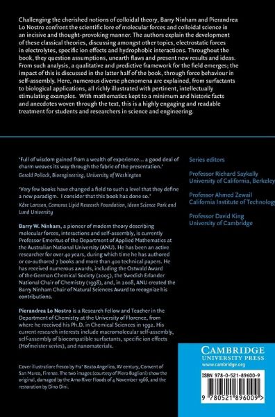 Part I. Molecular Forces: 1. Reasons for the enquiry 2. Different approaches to, and different kinds of molecular forces 3. Electrostatic forces in electrolytes in outline 4. The balance of forces 5. Quantum mechanical forces in condensed media 6. The extension of the Lifshitz theory to include electrolytes and Hofmeister effects 7. Specific ion effects 8. Effects of dissolved gas and other solutes on hydrophobic interactions Part II. Self Assembly: 9. Self assembly: overview 10. Self assembly in theory and practice 11. Bicontinuous phases and other structures: forces at work in biological systems 12. Emulsions and microemulsions 13. Forces at work: a miscellany of issues.