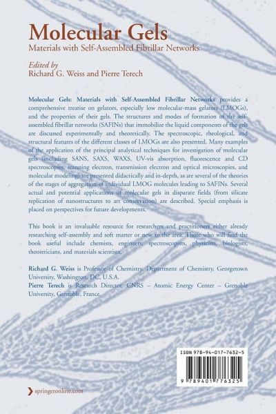 "Molecular Gels: Materials with Self-Assembled Fibrillar Networks" is a comprehensive treatise on gelators, especially low molecular-mass gelators and the properties of their gels. The structures and modes of formation of the self-assembled fibrillar networks (SAFINs) that immobilize the liquid components of the gels are discussed experimentally and theoretically. The spectroscopic, rheological, and structural features of the different classes of low molecular-mass gelators are also presented. Many examples of the application of the principal analytical techniques for investigation of molecular gels (including SANS, SAXS, WAXS, UV-vis absorption, fluorescence and CD spectroscopies, scanning electron, transmission electron and optical microscopies, and molecular modeling) are presented didactically and in-depth, as are several of the theories of the stages of aggregation of individual low molecular-mass gelator molecules leading to SAFINs. Several actual and potential applications of molecular gels in disparate fields (from silicate replication of nanostructures to art conservation) are described. Special emphasis is placed on perspectives for future developments.