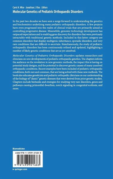 Molecular Genetics of Pediatric Orthopaedic Disorders updates researchers and clinicians of new developments of pediatric orthopaedic genetics. The chapters inform the audience on the revolution in new genomic methods and the impact this is having on potential study designs and the potential to discover genetic causes of many unsolved orthopaedic conditions. Recent examples have been included of pediatric orthopaedic conditions, both rare and common, that are being solved with these new methods. The book also educates pediatric orthopedic clinicians and geneticists on our understanding of the biology of "classic" genetic diseases that were derived from prior genetic studies. Chapters include biobanks and strategies for studying very rare disorders, genes and pathways causing primordial dwarfism, and notch signaling in congenital scoliosis, and more.
