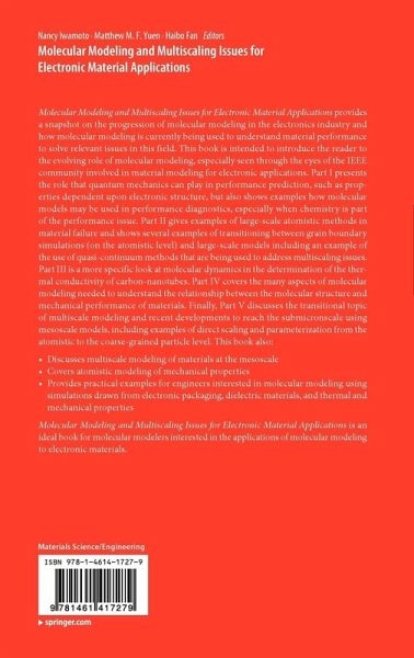Molecular Modeling and Multiscaling Issues for Electronic Material Applications provides a snapshot on the progression of molecular modeling in the electronics industry and how molecular modeling is currently being used to understand material performance to solve relevant issues in this field. This book is intended to introduce the reader to the evolving role of molecular modeling, especially seen through the eyes of the IEEE community involved in material modeling for electronic applications. Part I presents the role that quantum mechanics can play in performance prediction, such as properties dependent upon electronic structure, but also shows examples how molecular models may be used in performance diagnostics, especially when chemistry is part of the performance issue. Part II gives examples of large-scale atomistic methods in material failure and shows several examples of transitioning between grain boundary simulations (on the atomistic level)and large-scale models including an example of the use of quasi-continuum methods that are being used to address multiscaling issues. Part III is a more specific look at molecular dynamics in the determination of the thermal conductivity of carbon-nanotubes. Part IV covers the many aspects of molecular modeling needed to understand the relationship between the molecular structure and mechanical performance of materials. Finally, Part V discusses the transitional topic of multiscale modeling and recent developments to reach the submicronscale using mesoscale models, including examples of direct scaling and parameterization from the atomistic to the coarse-grained particle level.